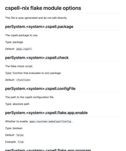 Cspell というものがあります。ソースコード中の単語のスペルをチェックしてくれるツールです。うっかりタイポして面倒なエラーになるのは嫌なので自分がソースコードを書くときはチェックをしています。 cspell.org それを nix flake check コマンドの中で…