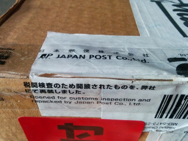 税関で箱開けられたみたいで郵便局のシールがその上に貼られてました。